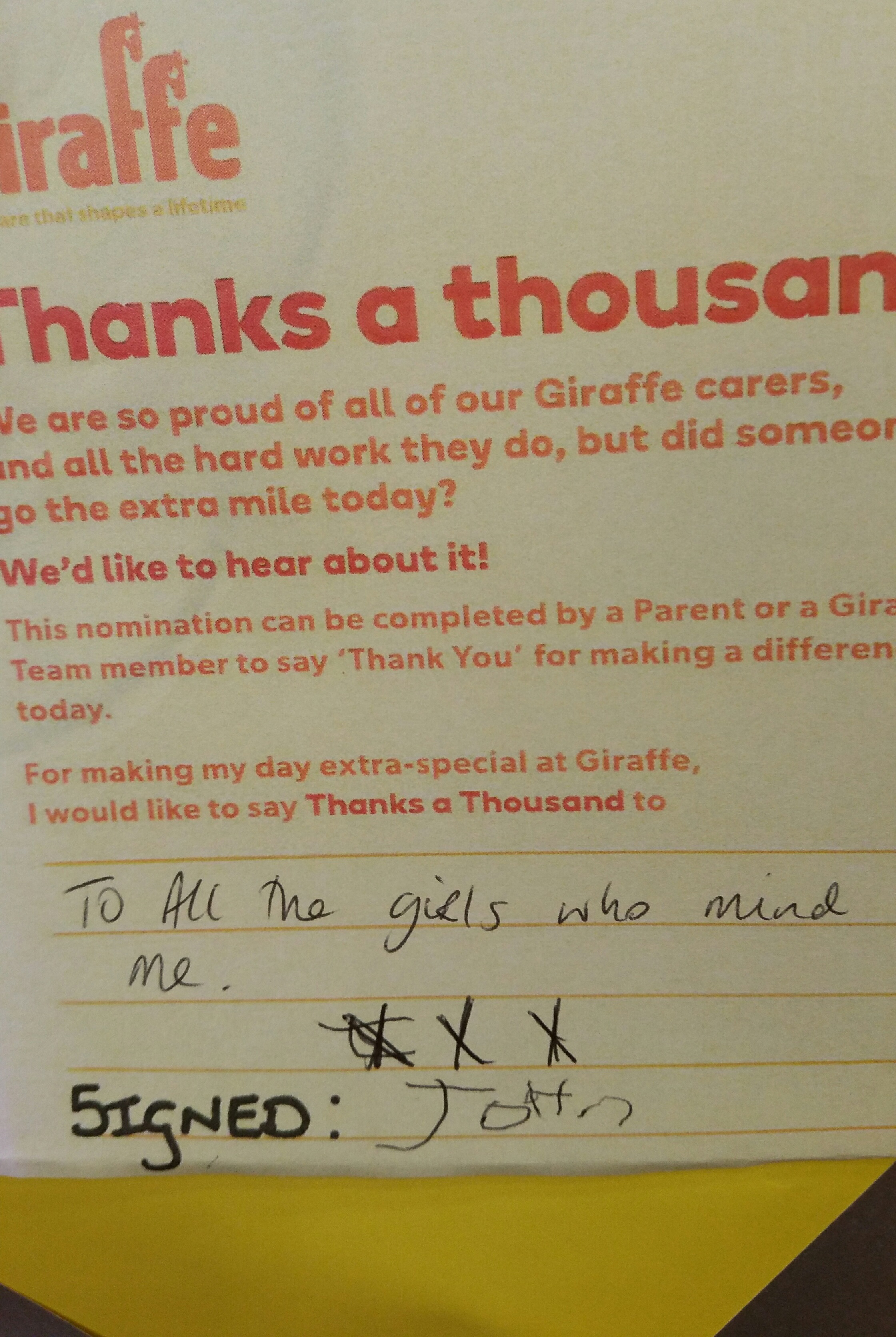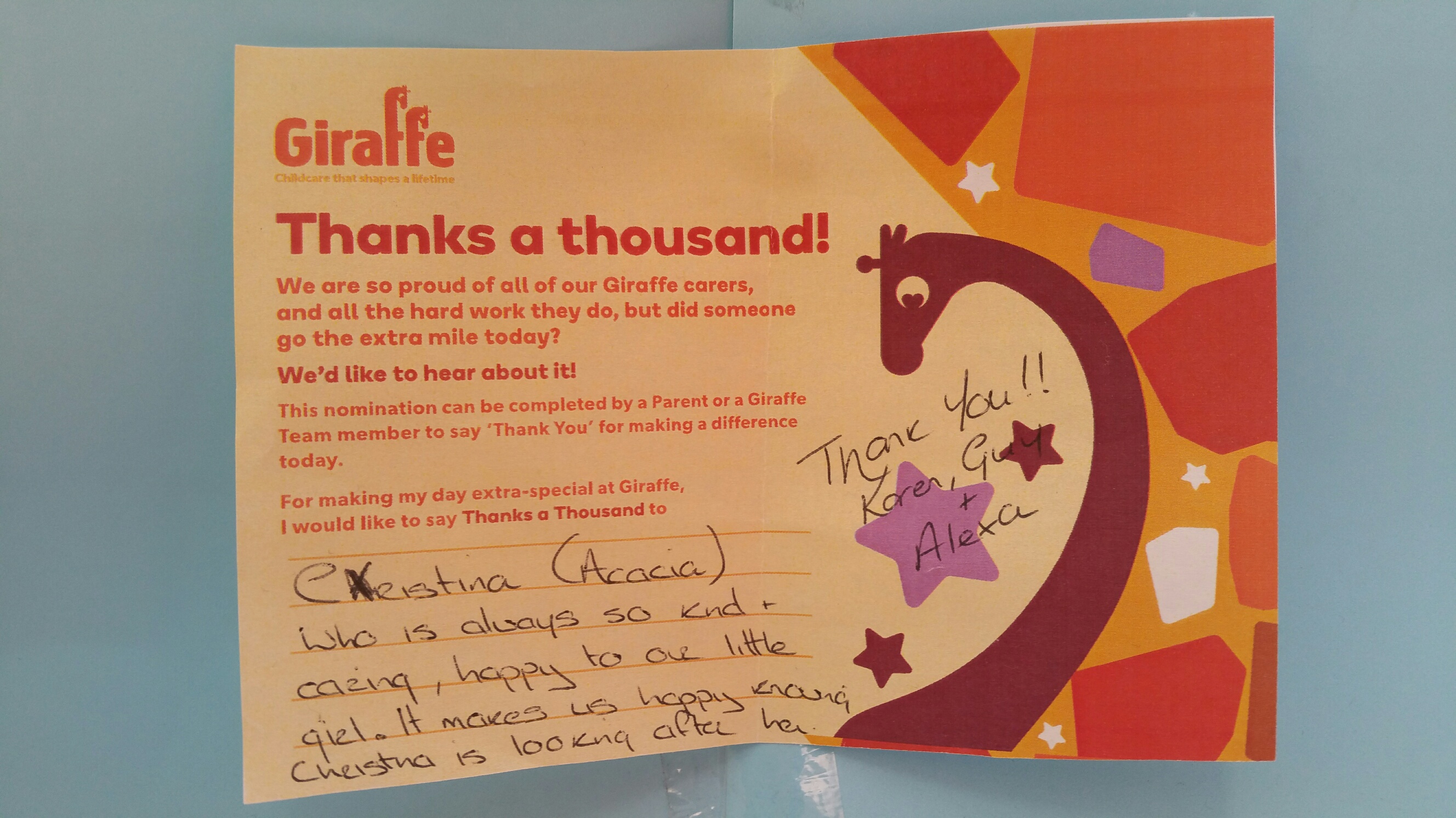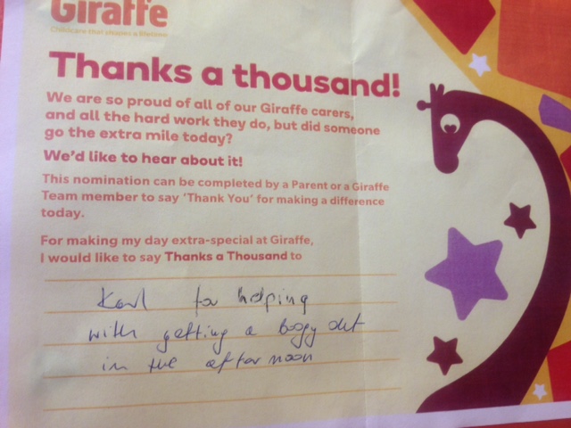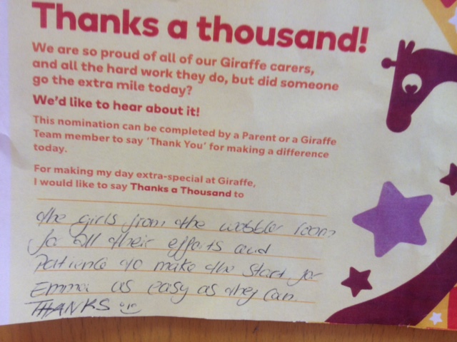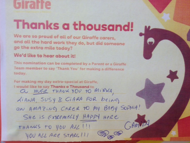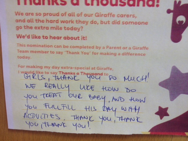 Throughout the month of May, our staff appreciation month, we have been inundated with beautiful message saying “Thanks a Thousand” to Giraffe team members, for the wonderful work they do every day. We understand that as parents, it can be difficult to leave your child with someone else, so it’s reassuring to hear from other parents about the great experience that their children enjoy in Giraffe every day.